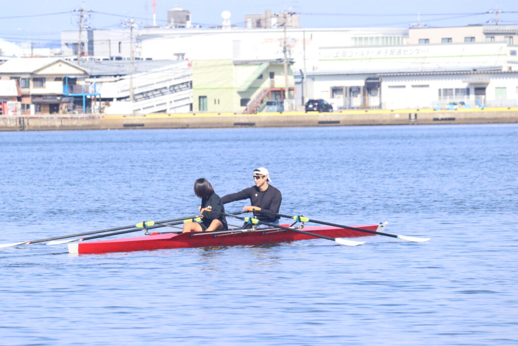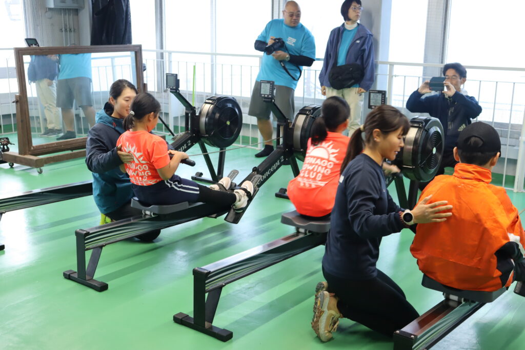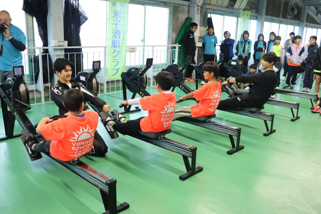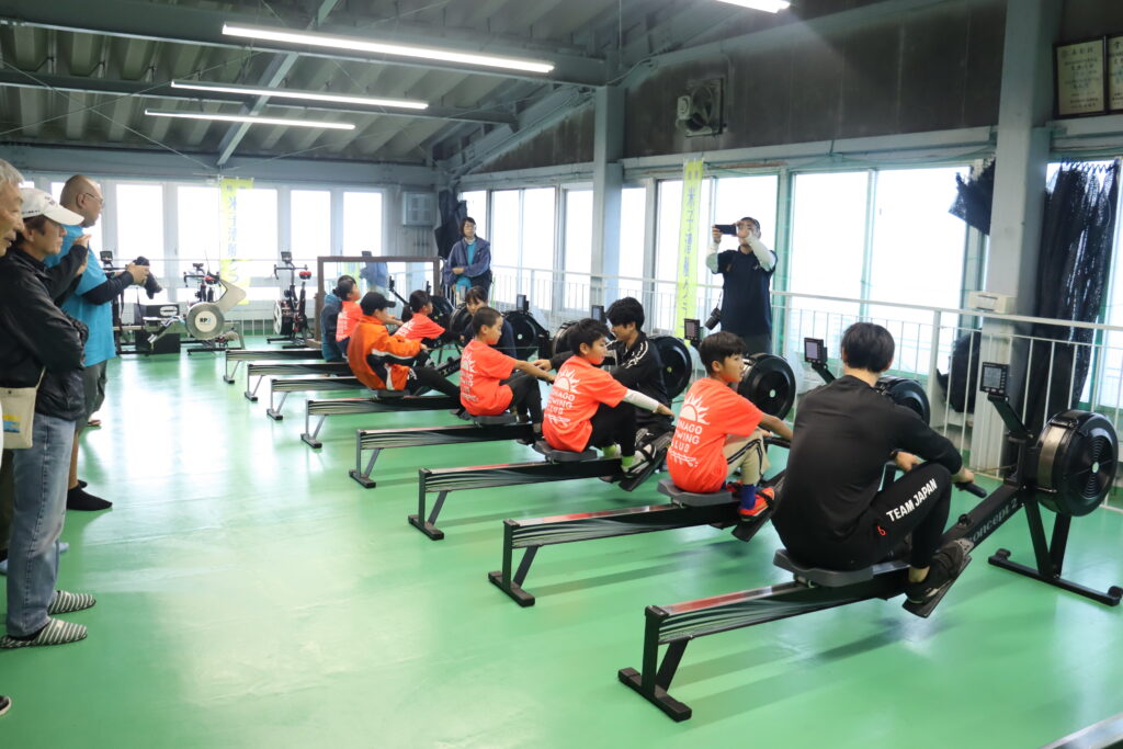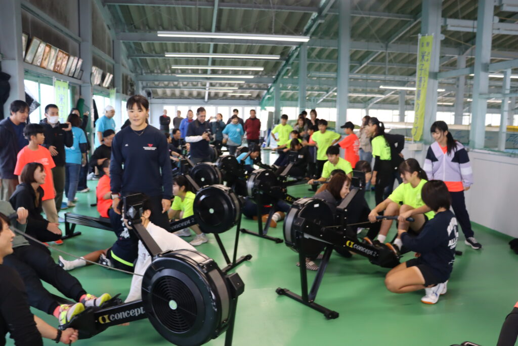 冨田選手、古田選手、土屋選手、来海選手と交流しました。ダブルスカル乗艇や、エルゴ指導、エルゴを使ったリレーなどが行われました